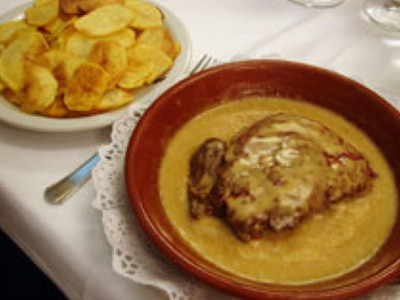 Numa frigideira com o fundo pesado derreta sobre lume vivo metade da porção da manteiga. Quando estiver bem quente introduza o bife e deixe alourar ligeiramente de um dos lados. Vire-o sem picar e aloure-o do outro lado (esta operação, que deve ser relativamente rápida, tem por fim evitar que o suco da carne saia). Tempere com sal grosso e pimenta moída na altura. Retire a gordura da frigideira (conservando lá o bife) e junte a restante manteiga. Reduza o lume, deixe cozer o bife durante uns minutos e, agitando a frigideira, adicione as natas. Deixe engrossar o molho agitando sempre. Coloque o bife num prato aquecido e regue com o molho. Sirva acompanhado com batatas fritas em palitos colocadas num prato coberto com um guardanapo. Se quiser pode juntar ao bife um fio de limão na altura de servir.