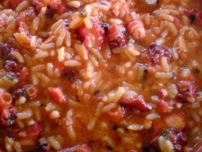 Lave e escorra o arroz. Adicione ao refogado o caldo reservado no quádruplo do volume de arroz e deixe ferver. Junte o arroz e deixe cozer. Rectifique os temperos. Sirva o arroz malandro, em prato individual.