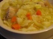 3 dl de feijão-de-cana , 230 g de castanhas frescas, 600 g de batatas, 150g de presunto, 1 cenoura, 300 g de repolho, Cerca de 2 l de água , 5 colheres de sopa de azeite, 2 dentes de alho, sal.