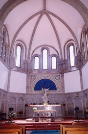 Igreja de Santa Maria (Nossa Senhora do Ó)-Águas Santas-Maia Monumento Nacional desde 1884, cuja data de construção é anterior à própria nacionalidade. Esta igreja foi fundada pelos cavaleiros do Santo Sepulcro, sendo dúplice, por nele morarem cónegos e cónegas de Santo Agostinho, da ordem regrante do Santo Sepulcro. De origem românica, possui duas naves com capiteis ornados com folhagens e decoram-na painéis pintados com motivos vegetalistas e animais. Destaca-se na sua frontaria o portal de quatro arquivoltas ogivadas, e, no lado norte, o portal de duas arquivoltas igualmente ogivadas, com a cruz de Malta no tímpano. |