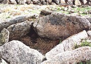 Anta da Portela (Santa Marta) Túmulo pré-histórico, popularmente designado por Forno dos Mouros,que consiste numa anta ou dólmen com câmara coberta e corredor, ao qual corresponderia uma mamoa de grandes dimensões. A câmara, poligonal, é constituída por sete esteios, sendo apenas três os que suportam a laje de cobertura. O corredor, voltado a nascente, é constituído por dez esteios e atinge cerca de seis metros de comprimento. Os esteios e a laje de cobertura são em monólitos graníticos; o túmulo é constituído por terra e pedra miúda. Esteios imbricados com inclinação para o interior, possuem anel de contenção na sua base. |