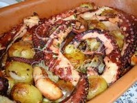 Coza o polvo na panela de pressão com uma cebola inteira, uma folha de louro, sal e pimenta, durante 30 minutos. Depois de cozido retire-o da panela e ponha-o numa travessa de barro.