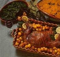Noutra travessa, coloca-se o cabrito inteiro e enfeita-se com raminhos de agriões.