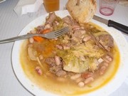 Descasque e pique as cebolas e os dentes de alhos; refogue ambos no azeite e junte a carne. adicione as cenouras, o chouriço e a linguiça cortados em rodelas e bacon em tiras; refogue lentamente. Acrescente o tomate picado sem pele e sem sementes, envolva tudo muito bem e refresque com o vinho tinto, reduza ate evaporar o álcool. de seguida, cubra com agua, tempere e deixe cozinhar durante 6 Minutos. junte a couve cortada em pedaços; tape o tacho e cozinhe durante 15 minutos. adicione o feijao e ferva por 2 minutos, rectifique os temperes e sirva.